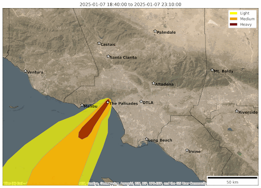 The animation on the right represents the movement of smoke across the Los Angeles area between January 7 and January 24, 2025. Dark red patches represent extremely smoky conditions (“heavy” smoke) and yellow representing less smoky air (“light” smoke). This is an estimate of the smoke’s behavior—the boundaries between orange and red, for example, should not be interpreted too precisely. The team expects that areas that were covered in red and orange plumes, particularly over consecutive days, may have greater overall exposure to pollution from the fires.